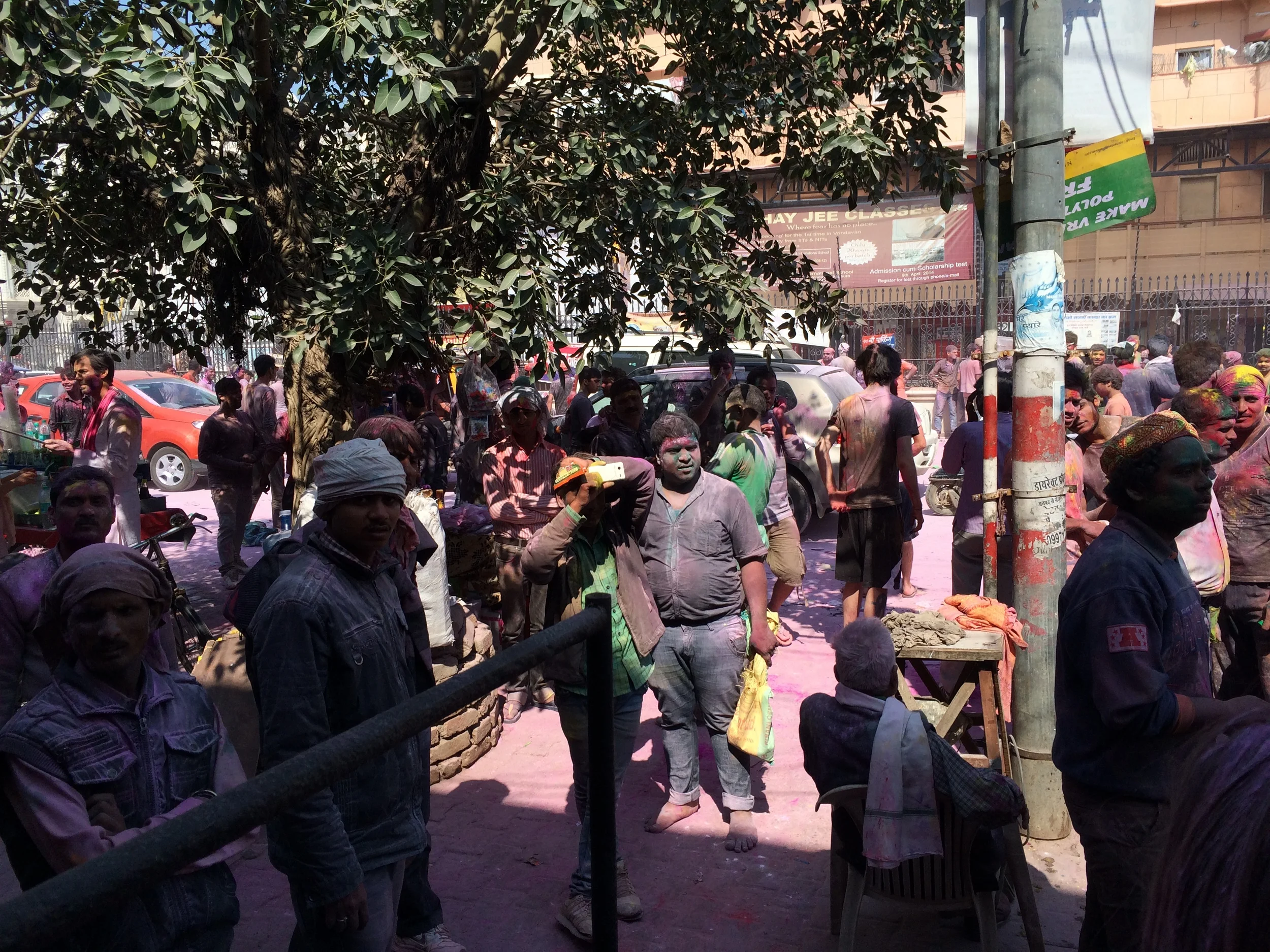 Holi 2015 started with a small private celebration in a random hotel courtyard that somehow everyone knew about but me. I don’t know who found out about this, where it was located, or even why they allowed us in, but I didn’t care because it excellent preparation for the torrent of people out in the city streets. There was dancing, singing, plenty of colored powder, and surprisingly even food! I don’t know where on earth I was, but there was good company and happy people all around.