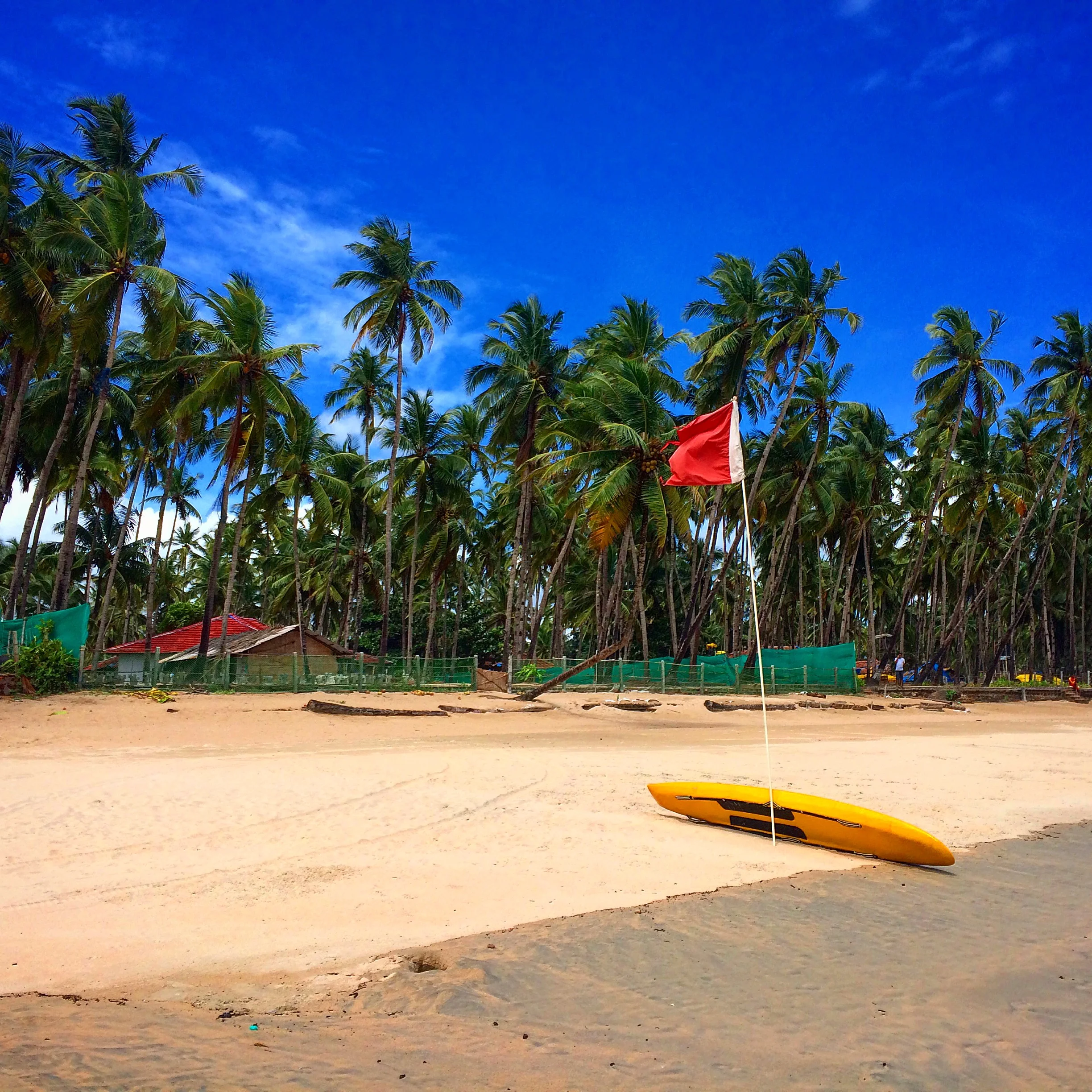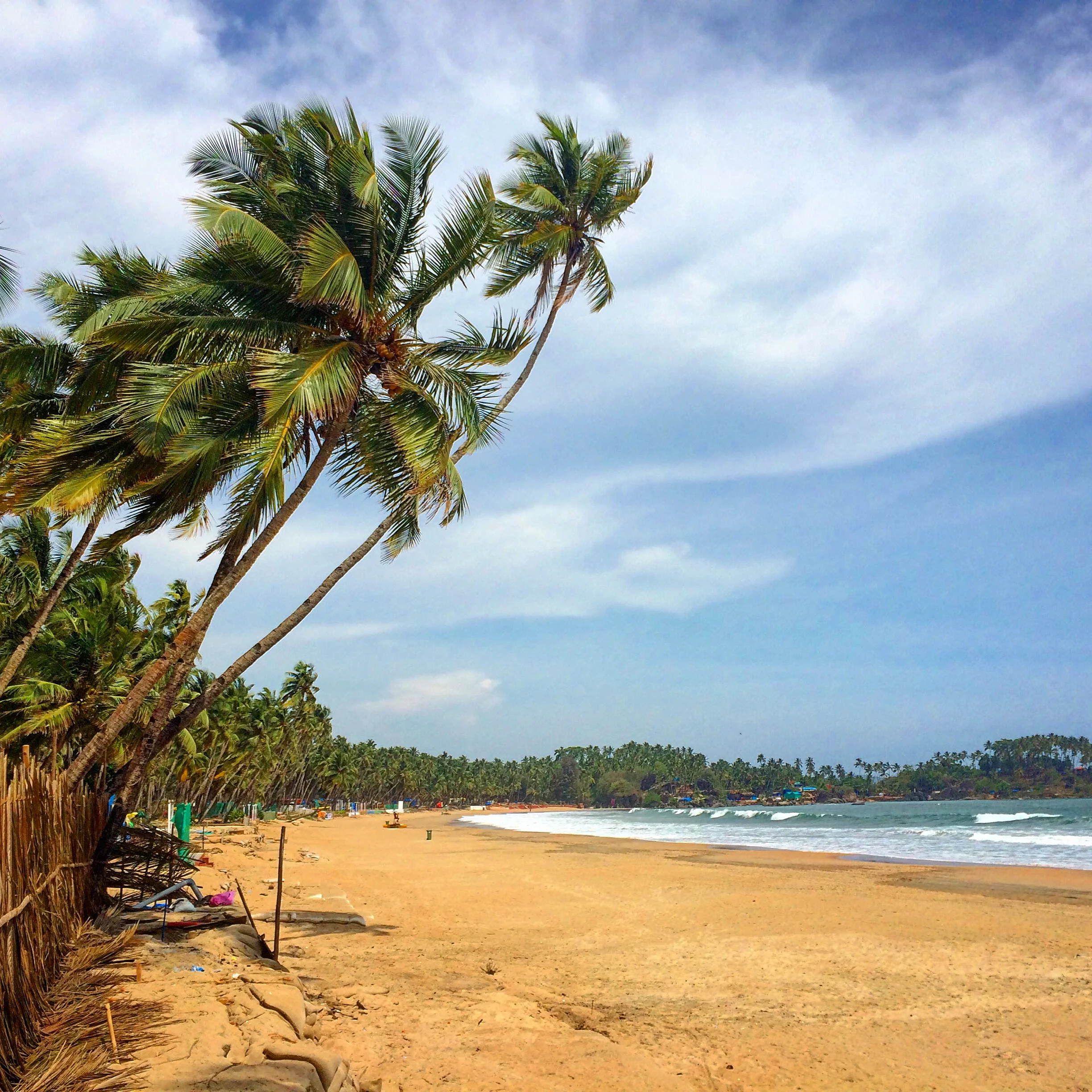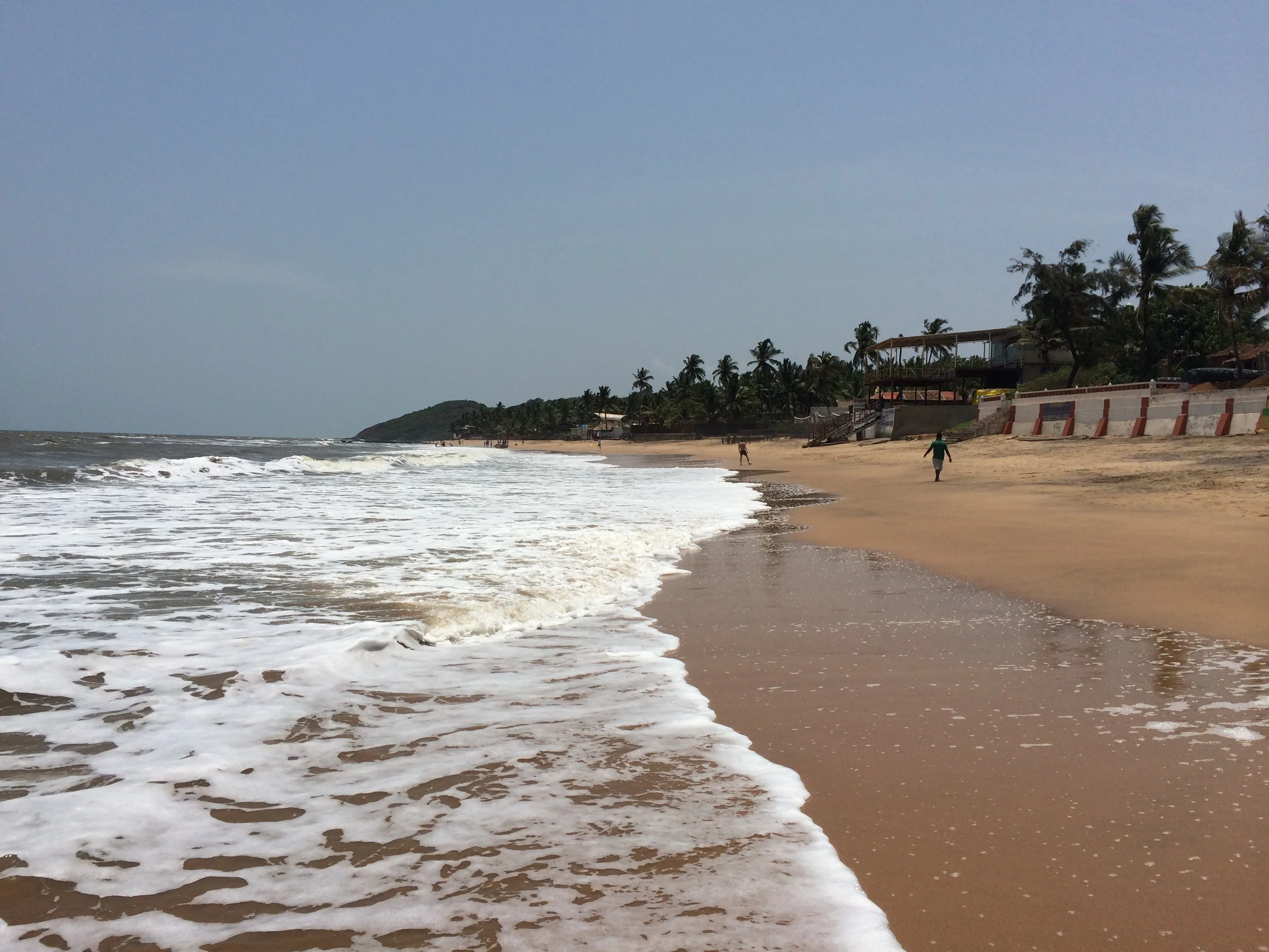 The temperature outside is nearly 37°C (~100°F), but thanks to the shade of the numerous palm trees and proximity to the beach, the air outside is cool and refreshing. Out in Anjuna, it appears the homes and roads are carved into the jungle-like environment. A variety of humble little residences flank the roads and range from solid hotels constructed of concrete and steel to flimsy shacks comprised of aluminum siding and tarps tied together. Occasionally a random scooter would pass me as I walked to the beach, but in general, it felt as if I had all of Anjuna to myself